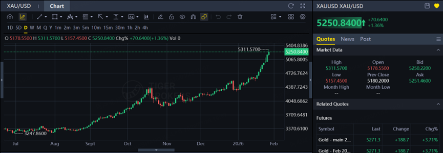 今日黄金站上5311美元历史新高。2026开年以来,从4332美元一路飙升超20%。