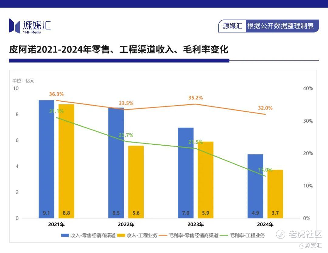 保利始终不会像恒大那样给供应商“喂奶”。皮阿诺的工程业务开始萎缩,并且越来越难赚到钱。公司工程业务从2021年的8.8亿元下降至2024年的3.7亿元,毛利率从31.1%腰斩至13%。