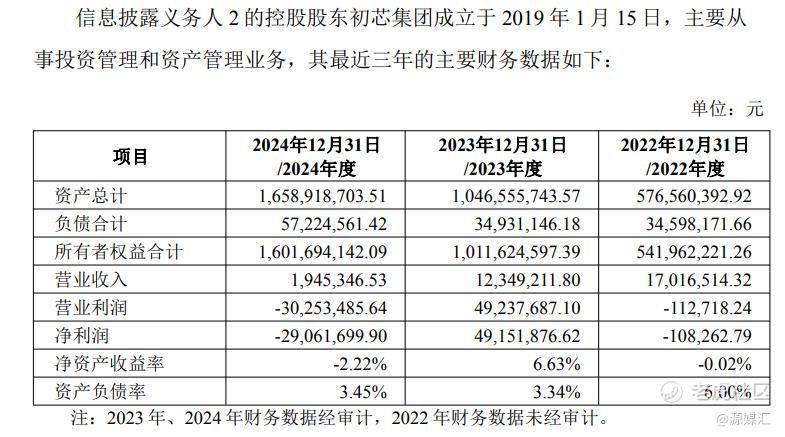 成立于2019年的初芯集团,当前资产规模不大但发展迅速,净利润则处于巨额亏损之中。2024年公司总资产约16.6亿元,净资产约16亿元,营收为194.5万元,净利润为-2906.2万元。