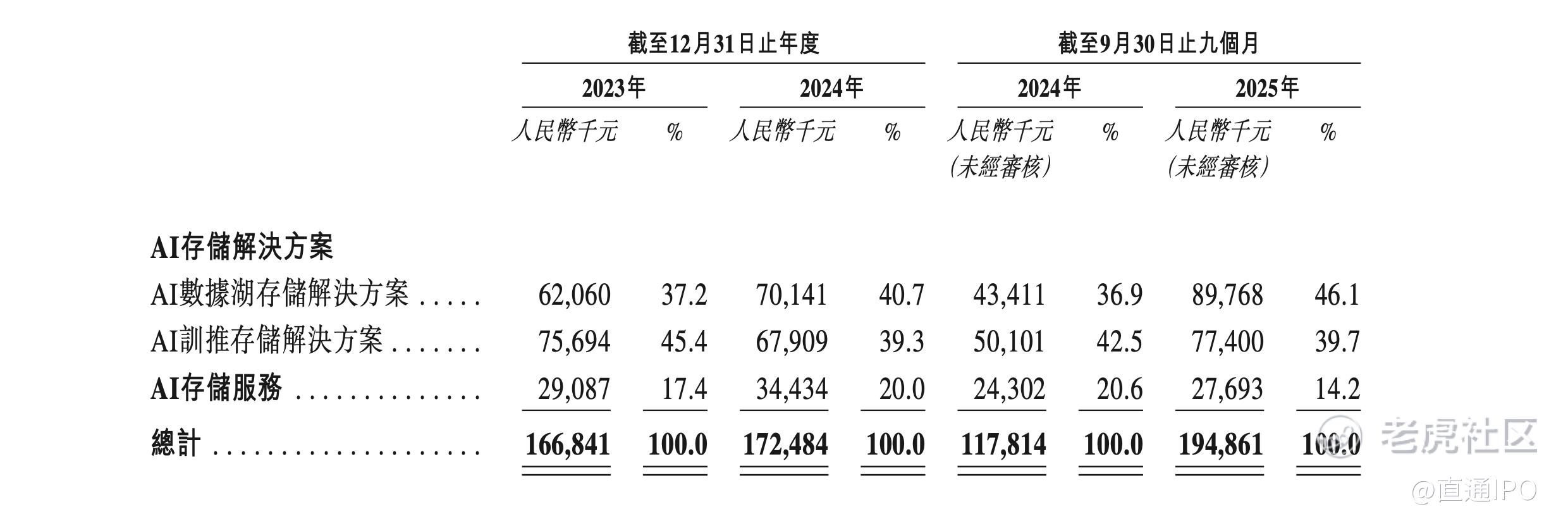以2025年前三季度为例,星辰天合来自AI数据湖存储解决方案的收入约8976.8万元,占比为46.1%;来自AI训推存储解决方案的收入约7740.0万元,占比为39.7%;来自AI存储服务的收入约2769.3万元,占比为14.2%。