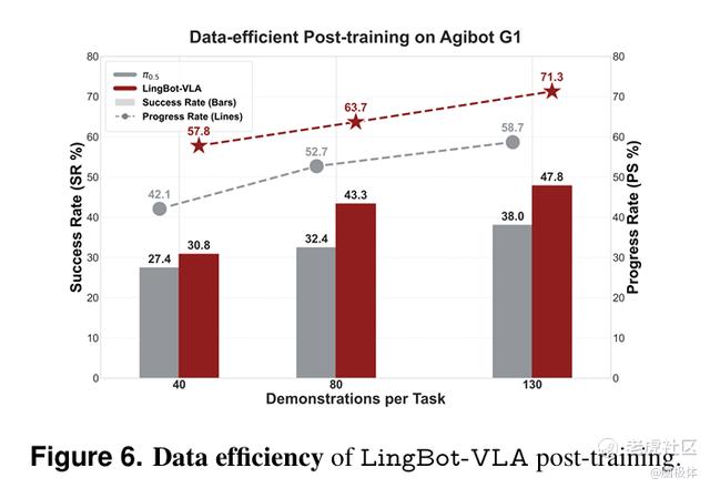 结果显示,在有限预算下,LingBot-VLA的Progress Rate(进度率)和 Success Rate(成功率)都优于Pi0.5。