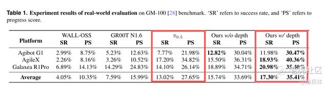 LingBot-VLA在GM-100真机评测基准(覆盖3类主流双臂机器人、100项复杂任务、每任务130次真机试错)上,平均成功率(SR)达17.30%,超越Pi0.5的13.02%。比指标更重要的,是多家本体厂商在真实硬件上完成了对LingBot-VLA的验证,这意味着行业终于有一个不吹牛、能落地的模型了。