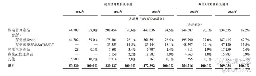爱芯元智自创立起便聚焦安防与工业视觉等相对冷门但落地周期更短的B端市场。招股书显示,2022-2025年1-9月,它的终端计算产品(包括视觉感知SoC、视觉感知辅助SoC和芯片)营收分别为4470万、2.08亿、4.47亿、2.34亿元,总营收占比分别为89%、90.6%、94.5%、87.2%,占比持续维持高位。