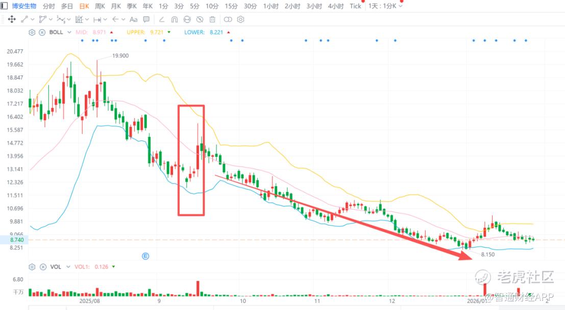 从技术面来看,去年 8 月以来,博安生物一直处于 “价跌量缩” 的下行通道中。整体来看,自去年 8 月 8 日在触及高点和 BOLL 线上轨后,博安生物股价便于次日走出一个 “变盘十字星”,并开始在后续向 BOLL 线下轨作技术回归。公司股价在随后的 3 个月内持续在 BOLL 线中下轨之间波动,市场情绪较为低迷。