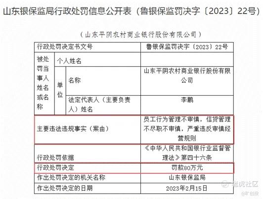 2023年2月,平阴农商行因员工行为管理不审慎,信贷管理不尽职不审慎,严重违反审慎经营规则,被山东银保监局罚款80万元。