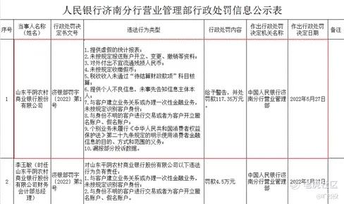 2022年5月,平阴农商行被中国人民银行济南分行开出了117.35万元的罚单,原因是其存在“提供虚假的统计报表、未按规定收缴假币、未按规定报送账户开立、变更、撤销等资料”等10项违法行为。