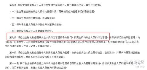 第一是《中国银监会关于印发银行业金融机构从业人员行为管理指引的通知》中明确提到,金融机构应该明确从业人员行为管理的牵头部门,负责全机构从业人员的行为管理。