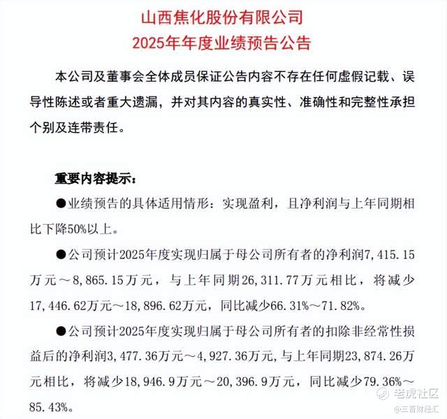 业绩预告显示,2025年山西焦化全年实现盈利,但净利润较上年同期大幅下滑,降幅超50%。