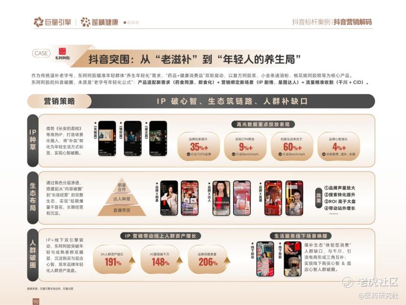比如,华润三九以短剧这种形式来强化消费市场对品牌的认知,定制剧超15部,总曝光量破60亿+,总互动人次突破1.69亿,积累品牌人群达1.17亿;东阿阿胶总结出一套“老字号年轻化公式”——产品适配新需求(药食同源、即食化)+营销绑定新场景(影视剧IP、明星达人)+流量精准收割,实现品牌词搜索量增长206%,拉新提升35%……