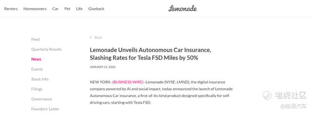 1月21日,Lemonade推出全球首款专为自动驾驶设计的车险产品:只要车主在行驶中启用特斯拉FSD(全自动驾驶)功能,该段里程的保费即可享受50%折扣。