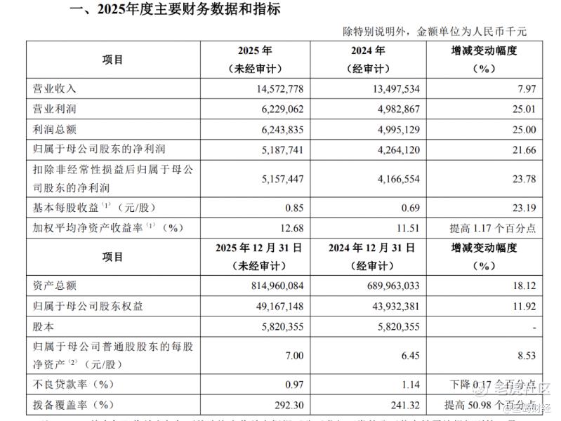 1月29日,青岛银行股份有限公司(002948.SZ)发布的2025年度业绩快报显示,净利润增速显著高于营收增速,差值达13.69个百分点。该行全年实现营业收入145.73亿元,同比增长7.97%;实现归母净利润51.88亿元,同比增长21.66%;扣非归母净利润51.57亿元,同比增长23.78%。