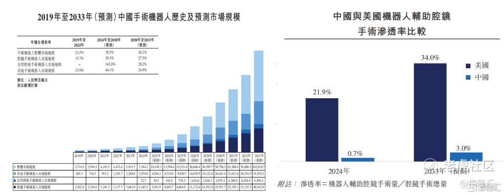弗若斯特沙利文报告显示,中国手术机器人市场规模预计将从2024年的71.8亿元,爆发式增长至2033年的1020.2亿元,年复合增长率高达34.3%。然而当前渗透率仍处于极低水平。2024年,中国机器人辅助腔镜手术渗透率仅为0.7%,远低于美国同期的21.9%。这一巨大差距,也预示着未来十年清晰的成长空间。
