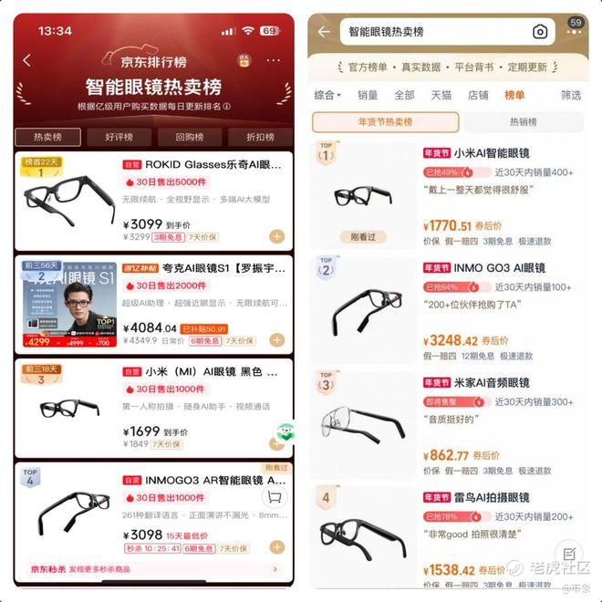 截至1月27日,京东智能眼镜热卖榜TOP30中,AI眼镜占比接近九成。其中ROKID Glasses乐奇连续22天排名第一,小米AI眼镜、INMO GO3、雷鸟V3、夸克S1等也稳定进入前十,淘宝榜单的结构基本一致。