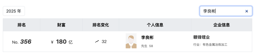 值得注意的是,进入2026年后,由于碳酸锂价格持续性较好,赣锋锂业股价继续上涨。作为赣锋锂业实际控制人,李良彬身价也是水涨船高。根据股权穿透,李良彬持有赣锋锂业约18.41%的股份,按照最新收盘价格计算其持股市值约为287亿元。根据2025年胡润百富榜数据,李良彬以180亿财富,位列榜单第356位。