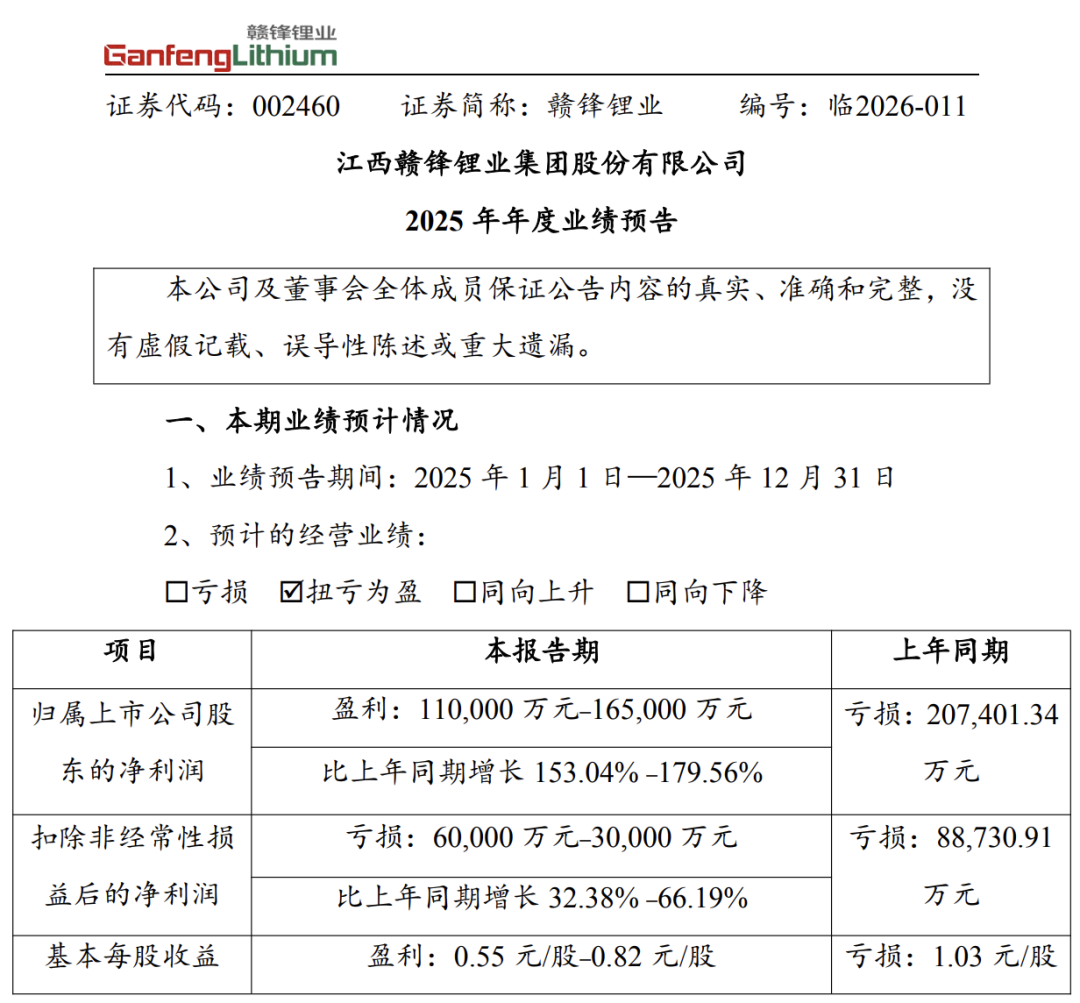 1月27日晚,锂矿龙头赣锋锂业发布了2025年全年业绩预告,公告显示,预计2025年赣锋锂业实现净利润11亿元至16.5亿元,同比增长153.04%至179.56%,去年同期亏损20.74亿元;扣非净利润亏损3亿元至6亿元,同比增长32.38%至66.19%,去年同期亏损8.87亿元;基本每股盈利0.55元/股至0.82元/股。