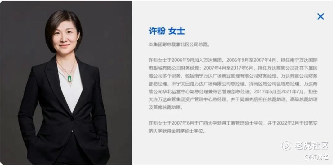 公开履历显示,许粉是在万达历练了20年的老将。许粉于2006年9月加入万达集团,最初担任南宁万达国际电影城有限公司财务经理。此后她在万达商管公司及其下属区域公司担任多个职务,2021年6月成为北区负责人。后出任大连万达商管集团资产管理中心总经理、总裁助理等职,2025年许粉担任珠海万达商管副总裁兼北区公司总裁,同时兼任北京、郑州等地万达广场商业管理公司执行董事、经理等职务。2023年荣获“全国巾帼建功标兵”称号,是王健林一手提拔上来的女高管。