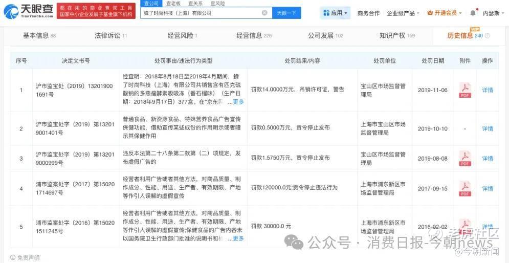 此外,蜂了时尚科技(上海)有限公司还曾因虚假广告被处罚:2017年因宣传“75种纯天然水果发酵”等虚构内容被罚款12万元,2019年另有上万元其他虚假广告相关处罚,均责令停止发布违法广告。