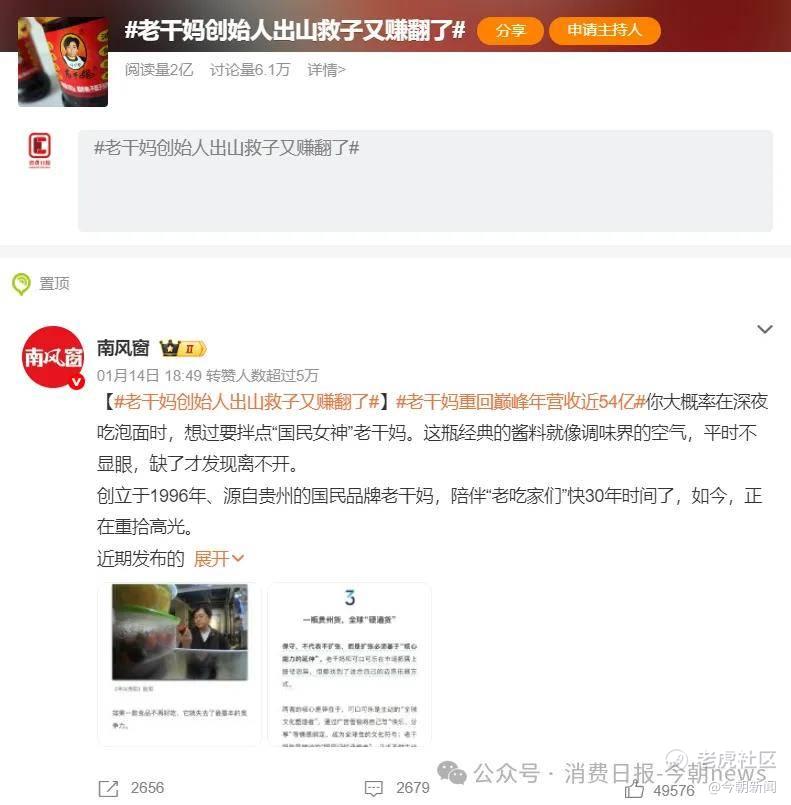 虽然2021年老干妈又因为李贵山的房地产项目云润天阳陷入“烂尾”风波受到牵连,叠加以“阿香婆”辣酱为代表的各类品牌抢占市场,营收回落至42.01亿元,但最终凭借陶华碧“李贵山个人投资行为与老干妈公司无关”的切割式回应,以及进一步强化产品品质管控,重新回归增长轨道。