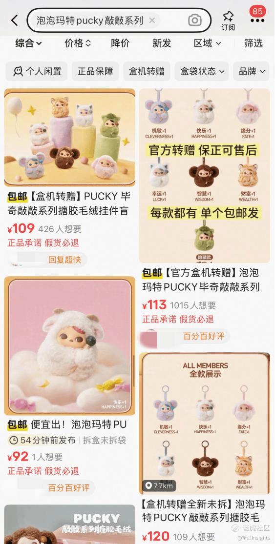 近日,泡泡玛特新推出了“PUCKY敲敲系列”毛绒挂件盲盒,因轻拍即可发出清脆木鱼声,被网友戏称为“电子木鱼”,相关话题火速登上微博热搜。同时,该盲盒每款还标注“财富+1”“快乐+1”等吉祥寓意,也被视为“打工治愈神器”。