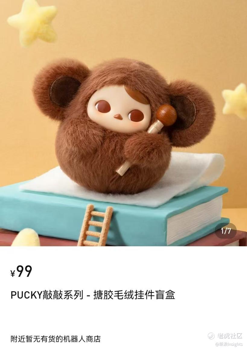 泡泡玛特小程序显示,“PUCKY敲敲系列”-搪胶毛绒挂件盲盒,高约9-11cm,挂绳(含挂环)7.5cm。该系列盲盒采用6款常规角色 + 1款隐藏款的配置,单个盲盒售价为99元,整盒(6个)售价为594元。目前,该系列在泡泡玛特小程序、天猫及京东旗舰店均显示已售罄,足见其市场热度。