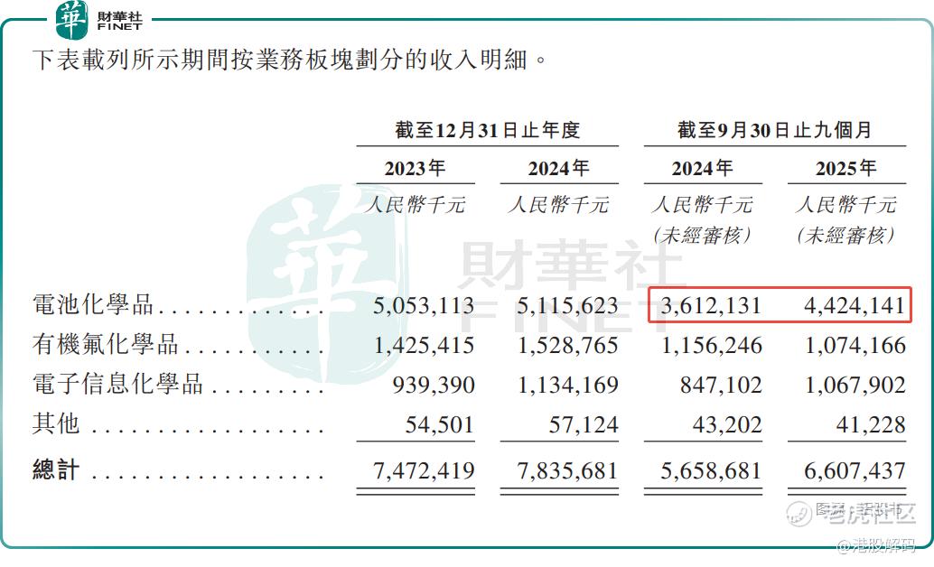 从业务结构看,电池化学品是其核心收入来源,2025年前三季度贡献收入44.24亿元,占比67.0%;电子信息化学品收入10.68亿元,占比16.2%;有机氟化学品收入10.74亿元,占比16.3%。