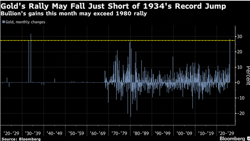 让我们把视角拉回历史走向,如果金价真的将在一月以5595美元以上的价位收尾,那么金价月涨幅将极度逼近30%。这一幅度将高于1980年1月27.5%的涨幅,仅次于1934年1月32%的涨幅: