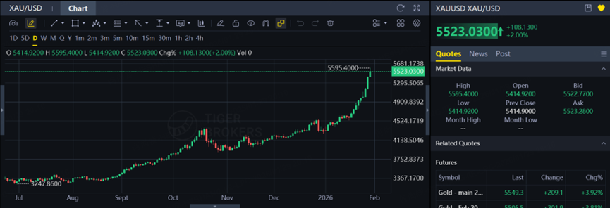 黄金连续九连涨,2026年迄今涨幅近30%。今日金价最高达5595美元,再创历史新高。