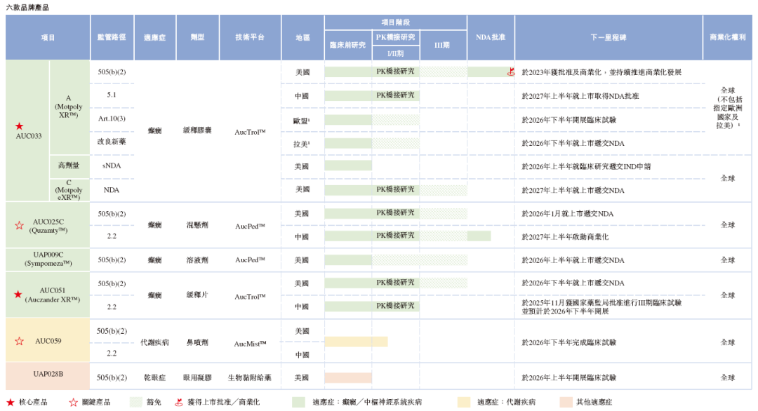 AUC033产品,包括已商业化的AUC033A(Motpoly XR™),其临床前阶段高剂量及临床阶段下一代AUC033C(Motpoly eXR™)。AUC033A于2023年5月通过505(b)(2)路径在美国获批上市。该产品开发用于治疗成人及体重至少50kg的儿科患者的局灶性癫痫发作,并可作为原发性全身强直阵挛癫痫发作的辅助疗法。