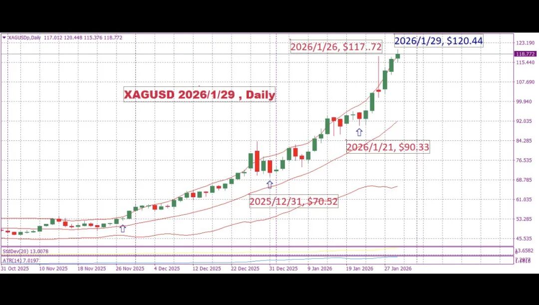 黄金(XAU/USD)今天再创历史新高$5597。金价已连续第九个交易日刷新纪录,在不到两周的时间内累计涨幅高达 20%,走势令人目眩。今天在黄金的带动下,白银也突破了1月26日的最高点$117.72,早盘创历史新高$120.