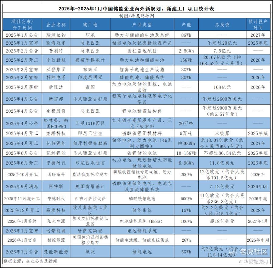 作为开年以来的重要的出海项目,中创新航掀起了中国储能企业出海建厂的新浪潮中。华夏能源网不完全统计,2025年至2026年1月,共有22个海外储能制造项目公布或开工建设,覆盖东南亚、中东、中亚、美国、欧洲等地区,合计总产能超过166GWh,涉及总投资超1223亿元。