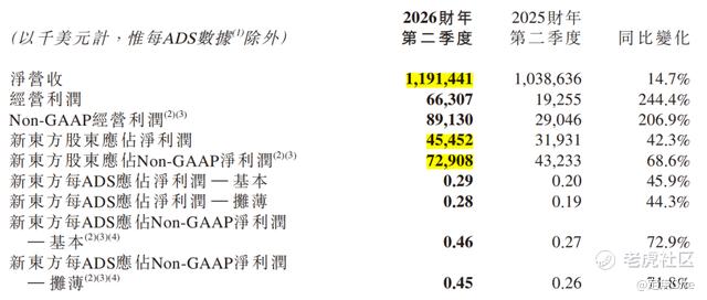 2026财年上半财年,新东方的整体业绩呈现出明显的修复迹象。期内净营收27.14亿美元,同比增长9.7%,净利润2.86亿美元,同比增长3.2%;经调整净利润为3.31亿美元,同比增长8.3%。