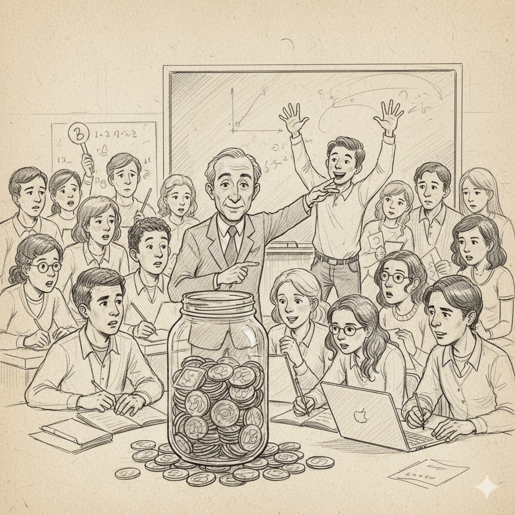 赛勒在大学里上课时,经常和学生们做一个“硬币罐头”的竞拍游戏。在教室里,一屋子“投资人”围着一个装满硬币的玻璃罐出价,谁出价最高,罐头就归谁。结果经常是这样:整体平均估值并不离谱,但最终赢下罐头的那个人,往往是最乐观的那一个,很容易把价格抬到不划算的区间。