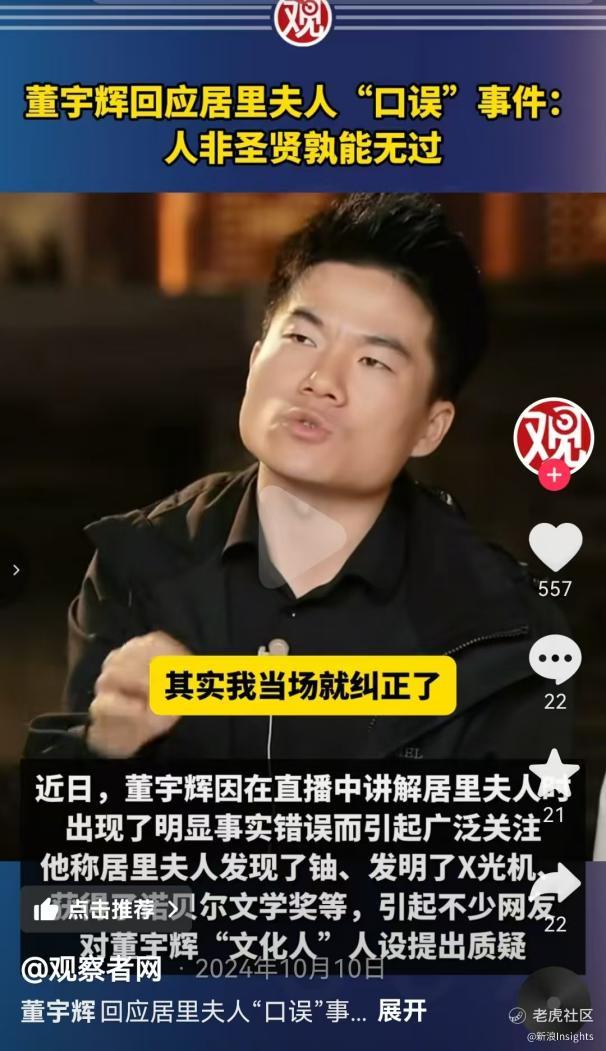 2024年9月,在直播中讲述居里夫人事迹时,董宇辉出现了几处令人讶异的事实性错误,如“发现了铀”、“发明X光机”、“获得诺贝尔文学奖”等,迅速引发公众对其知识严谨性的讨论。
