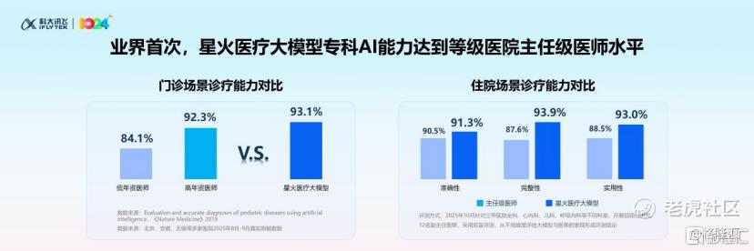 数据显示,其门诊场景诊断准确率达93.1%,优于高年资医师水平。而在更为复杂的住院场景中,诊断准确性、完整性和实用性同样突出,专科AI能力在业界首次达到等级医院主任级医师水平。
