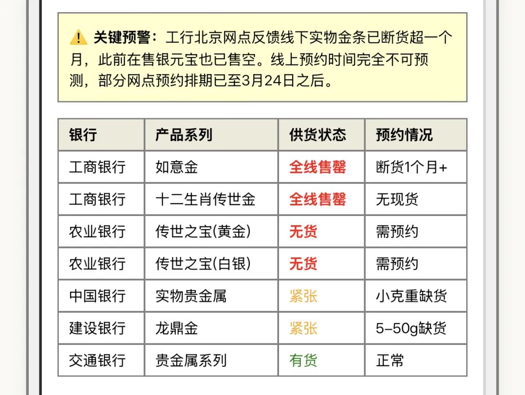 北京网点实地调查:线下金条断货已超1个月,预约排期至3月下旬。