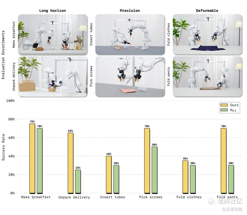 在机器人行业公认的LIBERO、RoboTwin两大测试基准中,这套架构让复杂任务的成功率分别达到98.5%和92%+,相当于在标准考题里几乎都能做对,成绩远超之前的技术。