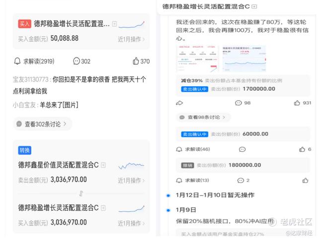 当日在某代销平台上,有基金大V晒出实盘操作截图,其在近一个月买入德邦稳盈增长C超过300万元,且收获不小浮盈。该大V的实盘操作引发了大量基民关注,彼时就有投资者质疑其为基金公司带货。