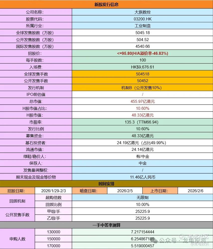 大族数控全球发售股数5045.18万股,每手股数100股,招股价不高于95.80元,入场费9676.61港元,采用机制B发行,公开发售手数50452手,甲乙组各分25226手,预计13-17万人参与,一手中签率5%左右,申购300手稳一手。