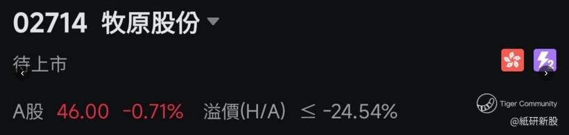 截至1月30日,牧原A股收报$46,H股上限定价的话折价24.54%