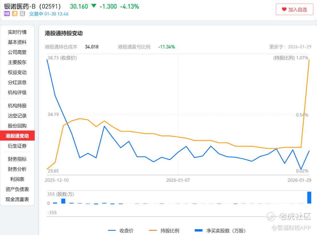 然而,随着公司股价接下来持续下跌,港股通资金并未跟进,相反却在不断卖出。1月27日,银诺医药的港股通持股比例仅剩0.27%。