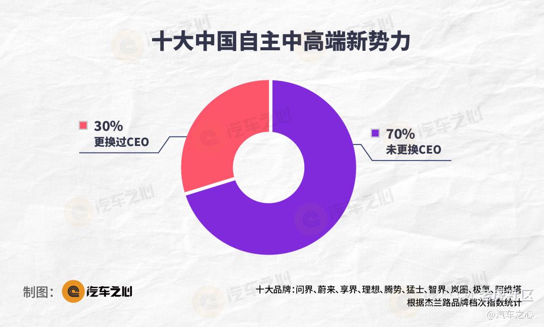 这在中国高端品牌历史上比较罕见。汽车之心统计了除魏牌在外的十大中国自主中高端新势力,发现未更换过CEO的高端品牌占70%,更换过CEO的高端品牌占30%,且平均每平均3.4年更换一次CEO。