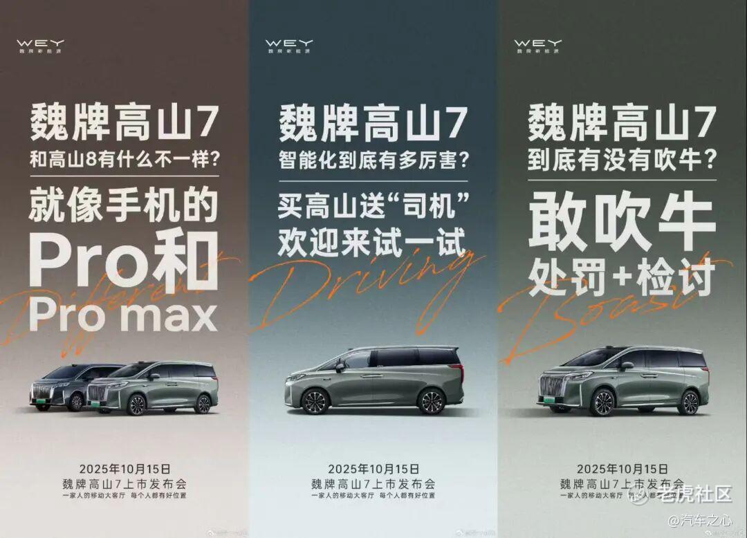 第二个改变,更新魏牌的传播调性。魏牌高山7发布前夕,一组海报可以管中窥豹,这组海报将高山7与高山8的区别,类比为手机Pro和Pro Max,这种传播调性,令人眼前一亮。