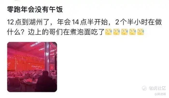 据零跑员工爆料,年会离谱到中午不管饭,HR建议大家自备干粮,活动开到一半饿得找零食、啃面包垫肚子。除了没饭吃之外,会场环境更是一言难尽,不仅没有空调冻得要死,而且厕所数量严重不足,热水供应也跟不上。更惨的是,部分承办方还赶上下雨天,只能在户外临时搭棚子硬撑。