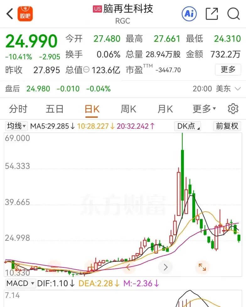一年前,经过去年6月进行的1股拆为38股的调整后,脑再生科技的股价为11美分。上周,该股股价约为29美元,市值约为140亿美元,日均交易量约为455,000股。拆股后,该股在6月中旬的最高收盘价为78美元,当时其市值超过380亿美元。