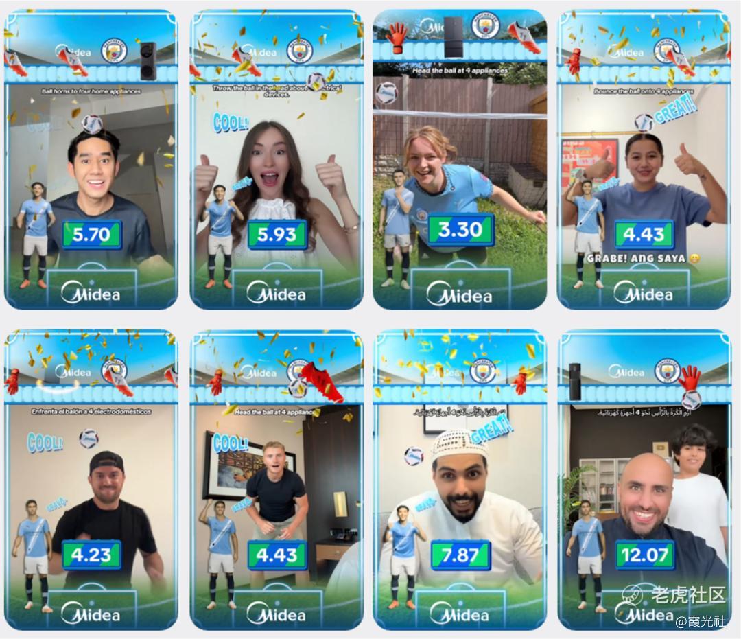 其次首创了“球星同框AR滤镜”玩法,让用户可在AR滤镜中实现与三位球星“同框传球”互动。让用户从被动观看,成为与球星并肩作战的参与者。此外还设计了“球星传球-用户接球-击中家电”的完整互动故事,搭配“Midea GO”的行动指令音效,不仅让互动更有趣,还顺带解决了全球用户对“Midea”(美的英文名称)品牌发音的认知问题。