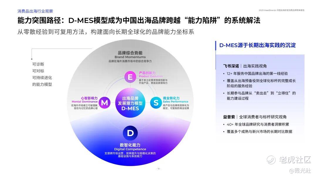 据悉,《报告》中榜单评选基于独特的D-MES模型进行,该模型源于飞书点跃BeyondClick与益普索长期出海服务实践及品牌研究的沉淀,对应品牌的数智化能力(D)、消费者心智影响力(M)、产品创新力(E)、商业转化力(S)四个方面。