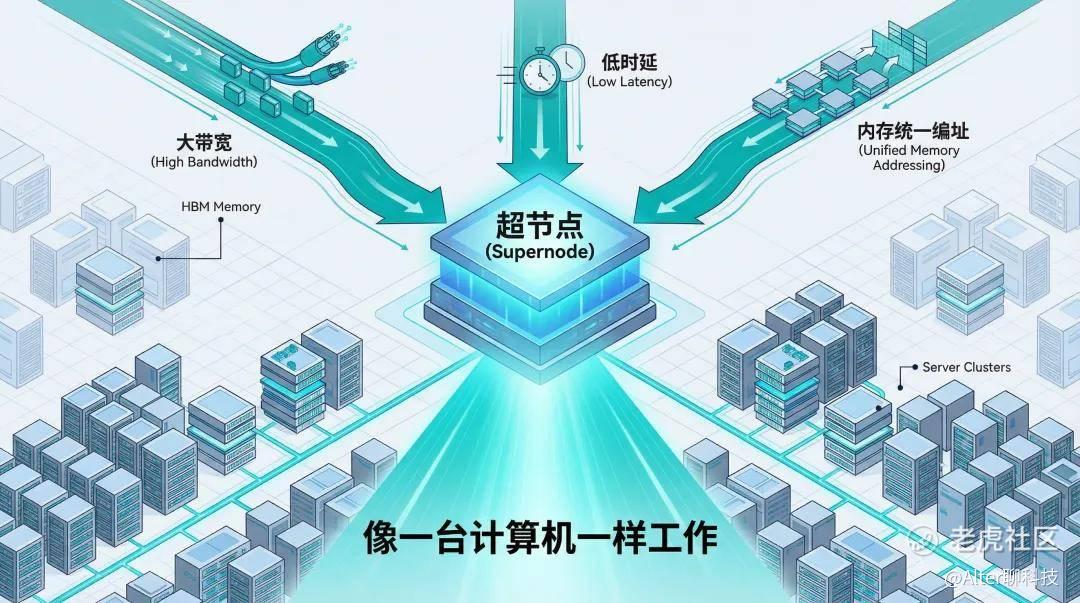 业界针对性地提出了“超节点”的概念,并规定了三个硬性指标——大带宽、低时延、内存统一编址。