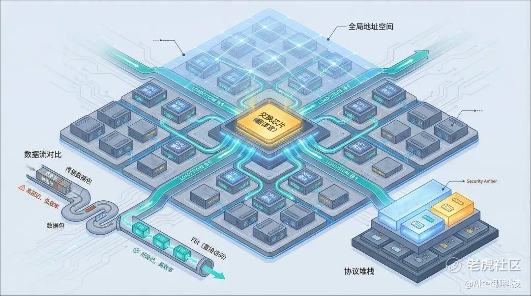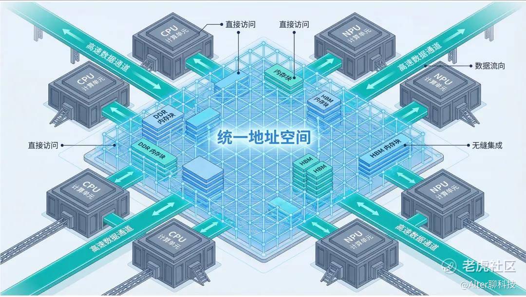 交换芯片扮演了“翻译官”的角色,让CPU、NPU/GPU等设备在统一的协议下互联互通,整合为一个统一的全局地址空间,不管数据存在哪块内存里,都只有一个“全局地址”,CPU、NPU/GPU之间可以直接通过地址访问。