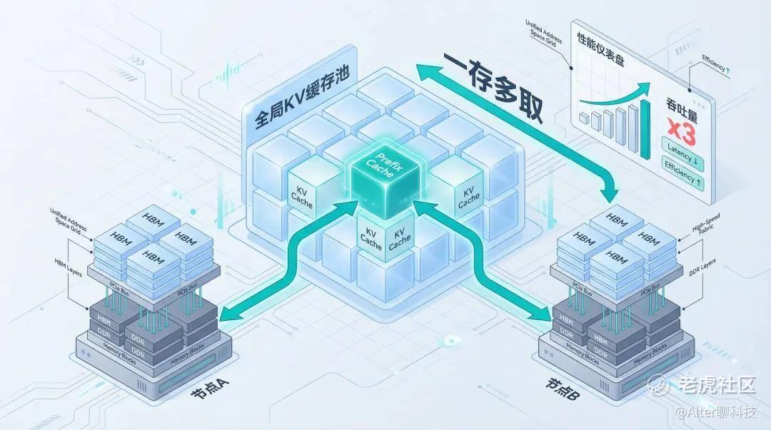 传统集群的KV Cache通常是绑定在单张卡的显存上的,如果用户问了一个超长的问题,节点A的显存被KV Cache撑爆了,附近的节点B即使显存空着,没有内存统一编址也无法借用,必须把任务重新调度、重新计算。