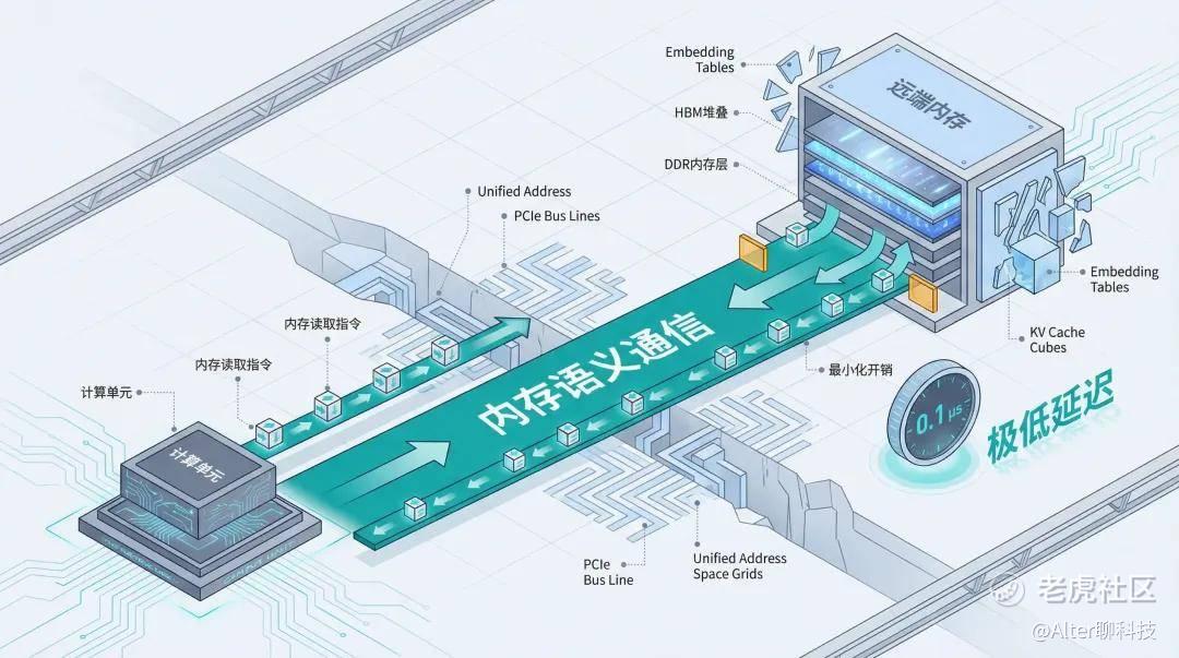 在推理过程中,模型需要频繁地从Host侧(CPU内存)或远端Device侧拉取特定的特征向量。如果是RoCE等“寄快递”的方式处理小包,光是打包拆包的开销就占了大头,导致严重的门铃效应,延迟居高不下。